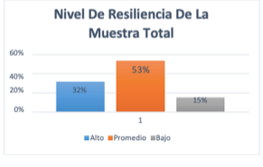 El factor 1, alcanza un mayor número de personas en promedio de nivel de resiliencia alto con un 60%, mientras que un nivel de resiliencia promedio con un 27%, y por otra parte un nivel de resiliencia bajo con un 13%. El factor 2, predomina un 47% con un nivel de resiliencia alto, mientras que un 38% se encuentran en un nivel de resiliencia promedio, y el restante de 15% ubicados en un nivel de resiliencia bajo. El factor 3, prevalece con un 43% del nivel de resiliencia promedio, seguido de un 30% con un nivel de resiliencia alto, y por último un 27% con un nivel de resiliencia bajo. El factor 4. puntúa el porcentaje más alto de un 52% del nivel de resiliencia promedio, mientras que un 33% de los pacientes se encuentran en un nivel de resiliencia alto, y el 15% restante ubicados en un nivel de resiliencia bajo.