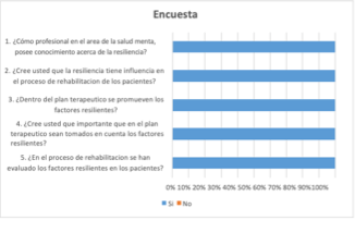 Los resultados obtenidos en la encuesta dirigida a los profesionales de la Comunidad Terapéutica tuvieron un total del 100% de respuesta positiva, lo que indica que en el tratamiento psicoterapéutico se promueven los factores resilientes.