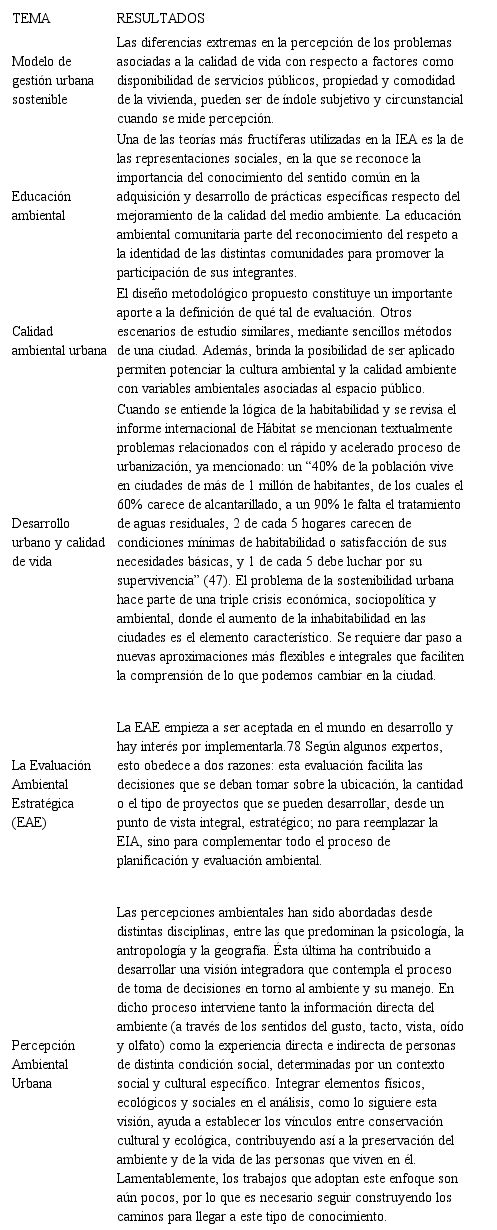 Los escritos de base sobre investigaciones de los diferentes autores correlacionadas con el tema de la sustentabilidad ambiental urbana que aportaron al desarrollo de la actual investigación están enunciados en la tabla siguiente (Tabla # 1), donde se pueden evidenciar las temáticas de interés y los aportes que tanto ellas como los resultados hicieron a la investigación presente: