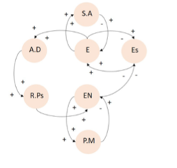 Cuando se presentan estos estímulos de forma permanente se hace más complicado para el sujeto evadir los efectos de los mismos, por ende busca refugio en otras soluciones que pueden conducir al consumo de alcohol, entre otras variantes que podrían empeorar su situación de salud y su estado emocional. Cuando la influencia de los estímulos estresores es muy fuerte, se empiezan a manifestar otras reacciones en el organismo, ocasionando problemas más serios de salud, problemas de conducta y problemas emocionales que podrían llegar a ser irreparables si no se atienden de forma apropiada. Según (Rojas Sierra, 2012), (Amador Moncada, Granada Díaz, Redondo Ostegón, & Tost, 2017) las ecuaciones dinámicas son productos de una relación causa-efecto, basado en los flujos de entrada y salida. En este trabajo se ha considerado un diagrama de estados, como se observa en la figura 2. Donde los estados varían desde el estrés hasta la eliminación del estresor, que produce el afrontamiento a la enfermedad, como consecuencia de una solución médica profesional. La dinámica propuesta por (Forrestere, 1977), (Amador Moncada, Granada Díaz, Redondo Ostegón, & Tost, 2017) supone la vinculación de variables de un determinado sistema con el fin de alcanzar las dependencias entre ellas y sus efectos. Se ha considerado un diagrama de estados que consiste en una representación del estrés, E, estresor, Es, y también aquellas variables asociadas a los estados de salud de las personas. Se ha tomado en cuenta que cuando el estresor aumenta, el nivel de estrés también aumenta, y en consecuencia la persona afectada tiende a buscar soluciones para intentar equilibrar esta situación, estas soluciones no son tales, pues en su mayoría suelen ser el alcohol, la ingesta excesiva de alimentos, las salidas a fiestas y demás actividades que suelen utilizarse para disfrazar la situación de estrés, que además se vinculan con un mecanismo de autodefensa del organismo y resistencia para abordar la situación de estrés. Cuando estas posibles soluciones actúan es posibleobservar una posible mejora del estado de salud, que a su vez, irá en decremento a medida que el estresor siga presente y que las soluciones aparentes no puedan producir el efecto real que se espera, para finalmente ser indispensable la ayuda de un profesional médico. En la figura 1 se muestran las relaciones entre el estresor y el desencadenamiento de un mal estado de salud en las personas, siendo necesaria la reducción del estresor para mejorar las condiciones del estrés y en consecuencia, el mejoramiento de la salud del paciente.