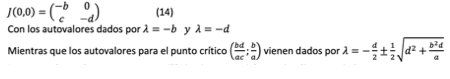 La intersección de las nuclinas dadas en (7) y (8) definen estos puntos críticos dados por (9). Es posible entonces que este sistema no lineal pueda ser linealizado con un desarrollo de Taylor en el punto crítico, en este punto las variables que definen el comportamiento del sistema no manifiestan cambios o variaciones y por tanto, las derivadas asociadas a ellas se anulan. Por lo que las ecuaciones en el punto de funcionamiento se expresan como: