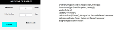 Se tomó en cuenta la valoración del pulso y la respiración para una primera prueba, donde fue posible constatar que cuando los valores del pulso superaban los 20 latidos por minutos, y la respiración era mayor a 90 revoluciones por minutos, se hacía muy evidente la presencia del estrés. El software diseñado permite mediante una ventana simple verificar la presencia de estrés ante la evaluación de estos parámetros (Figura 4a). La interfaz diseñada utilizó una red neuronal del tipo adaptativa, que aborda situaciones de reconocimiento y de predicción de los patrones seleccionados como variables (Figura 3b).