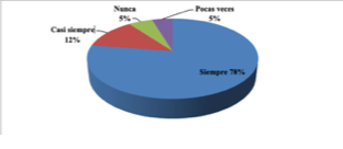 De los treinta entrevistados sólo tres orientadores (10%) manifestaron que aplicaban siempre una comunicación afectiva. Esta es la diferencia de mayor contraste con respecto al gráfico anterior, en el cual 23 orientadores respondieron que siempre practican una comunicación efectiva.