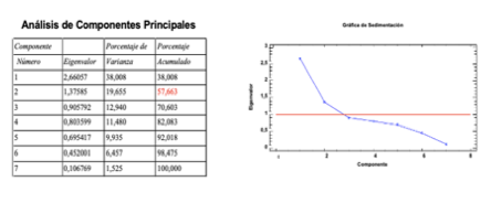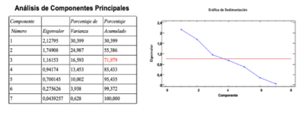 Para el caso del cantón Milagro el análisis de componentes principales determino que, de las 7 variables, 3 explican la mayor variabilidad de los datos. Por lo que podemos argumentar, que 3 componentes tuvieron eigenvalores mayores o iguales que 1,0. En conjunto ellos explican 71,9795% de la variabilidad en los datos originales.