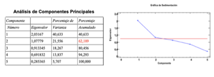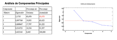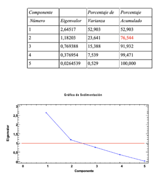 Al momento de realizar el análisis de componentes principales se determinó que para el caso del cantón el Empalme de las 5 variables, 2 explican la mayor variabilidad de los datos. Por lo que podemos argumentar, que 2 componentes tuvieron eigenvalores mayores o iguales que 1,0. En conjunto ellos explican 62,1892% de la variabilidad en los datos originales.