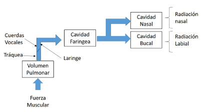 La expulsión del aire depende de la energía de los músculos del tórax, cuando el tórax se contrae se produce un aumento de la presión pulmonar, lo que expulsa el aire y lo hace atravesar los bronquios y la tráquea, actuando como excitatriz del conducto vocal. Una vez realizado este proceso es posible producir una voz sonora, como consecuencia de la tensión en las cuerdas vocales, que vibran producto del flujo de aire. También es posible generar una voz sorda, producto de una obstrucción en el flujo de aire que atraviesa la cavidad vocal.