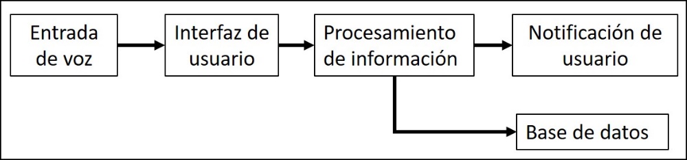 La figura 3 describe la estructura funcional del sistema, en ella se observa un proceso sencillo con entrada de voz, que es absorbida por el sistema para ser procesada dependiendo de los valores establecidos para ello. Luego esta señal es visualizada en una interfaz que permite la observación de la señal, y a través de la misma es posible ejecutar el procesamiento, que conducirá a las notificaciones de usuarios y al mismo tiempo enviará los datos a un almacenamiento para su posterior uso.