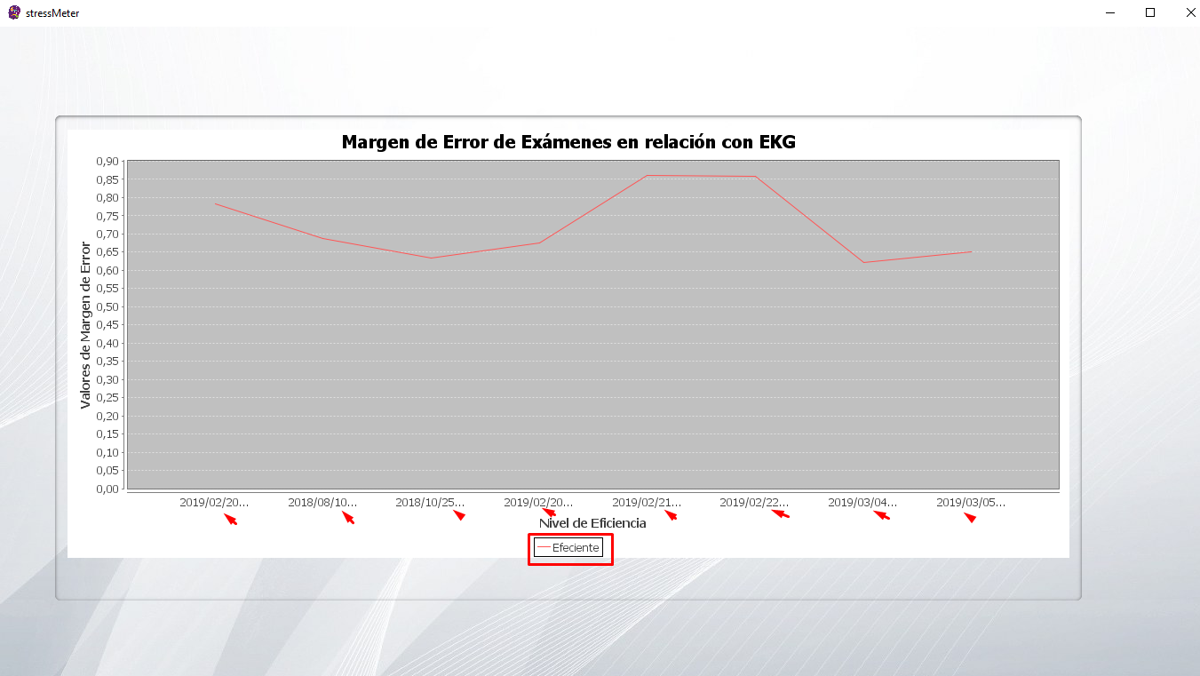 El porcentaje de error es medido con las señales EKG, quienes proporcionan las alteraciones cardíacas presentes en las personas según los estados de ánimos de las mismas. La figura 3 muestra los resultados del nivel de estrés en contraste con las señales EKG. Mientras que en la figura 4, se muestra el error presente en la señal. La red neuronal de tipo bayesiana recibe todos los resultados obtenidos en los exámenes y los compara con la base de EKG de esta manera calcula y busca la variación probabilística en cada uno de los resultados obtenidos.