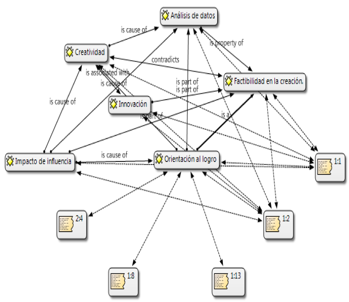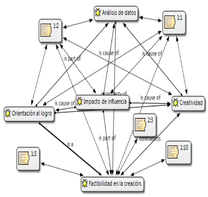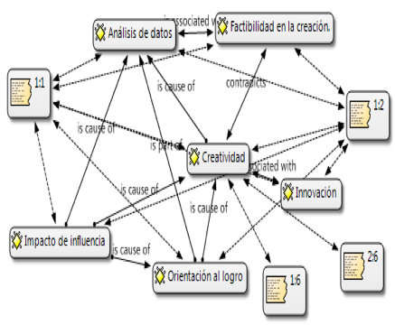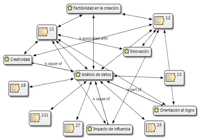 For the analysis and interpretation of the results, we used the software program, referred to above, called Atlas ti, which helps to relate all the data provided by the interviewee, allowing the collection of the necessary information to serve as a guide for this and future research, the results obtained by the Atlas.ti software program are shown below. Due to the adequacy of interpersonal relationships, the interviewees will be urged to feel comfortable and confident, so that, hoping in the freedom of expression, they can build their vision of reality in relation to the questions asked and in correspondence with the subcategories: creativity, achievement orientation, innovation, data analysis. The questions of the instrument in question have the following order.