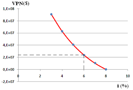 Figure 2 shows the behavior of the NPV when varying the interest rate in the range of 3% to 8% for a given project, the initial (equilibrium) value was 6% with the rest of the variables, which yielded an NPV of $25.3.10.Note the marked influence of this factor on profitability.