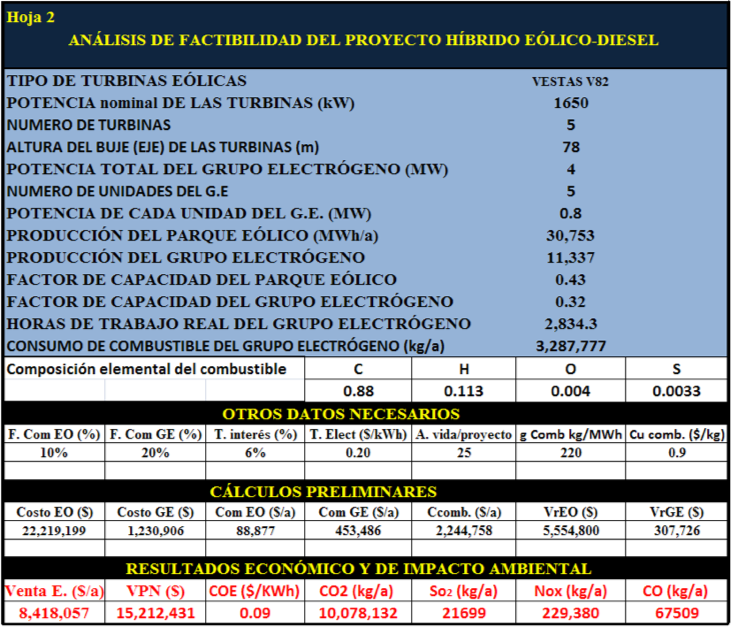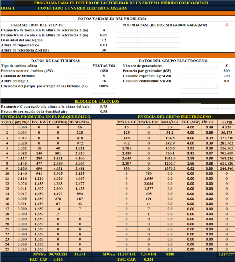 The system is composed of 5 VESTAS generators of 1650 kW power and a generator set composed of five generators of 800 kW power, for a total of 4 MW which is the maximum load of the system. Figure 1 shows the input data and the calculations of wind energy produced, energy supplied by the genset, excess energy, which is the energy produced by the wind generators above the demand; the annual fuel consumption is also determined.