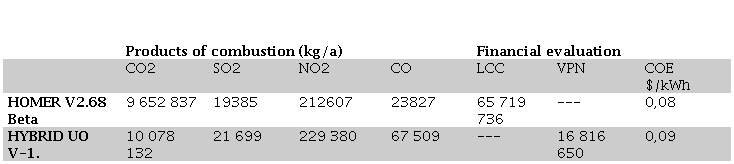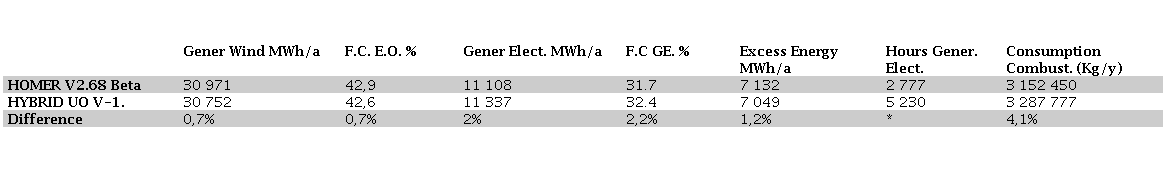 The above results were compared with those obtained by the HOMER professional software when supplied with the same data in an isolated system. Table 1. The results are shown. It is observed that in the energy parameters the difference is very small; in the case of the generator set working hours there is apparently a very large difference, this is because HOMER performs the calculation by dividing the annual energy developed by the generator set (11 108 MWh/y) by the power of the set (4MW), resulting in 2777 hours. In the proposed method, the number of hours is obtained by adding the times that the genset contributes to the grid, i.e.: