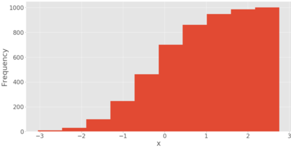 The histogram above shows the cumulative values. The frequency of the first tray on the left is the number of items in the tray. The frequency of the second tray is the sum total of the number of items in the second and first tray. The next boxes followed a similar pattern. Finally, the last frequency box on the right was the total number of items available in the data set, which in this case was 1000.