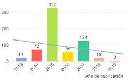 Figure 2 shows the history of the scientific publications produced by UNACH,where a growing trend is observed in the number of works, its largest year of production being 2018 with 70 publications, in contrast to 2013 in which there was only one published manuscript. It should