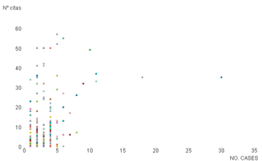 In the correlation analysis carried out to the number of citations with respect to the number of authors and the volume of the journals, although there is no relevant relationship, said correlation allowed to discover publications that stood out with a high number of citations, which leads to think that certain areas of study and publications are more sought after for