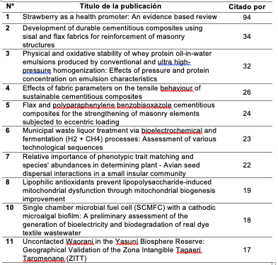 Scientific publications are part of the educational and especially university work, where the impact of said publications is reflected by the number of citations that scientific documents published in HEI have, thus the increase in publications in UNACH and in Ecuador in general is considerable; however this increase alone is not enough,and should be accompanied by the number of citations,that is,the published works generate expectations in the world research community. In this analysis, it was possible to observe research works that have never been cited despite the fact that they were published a few years ago. Thus, the publications with the highest citations are not related to the number of authors or the volume of the published journal, but are supported by quality research of several years and correspond mostly to