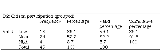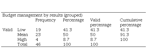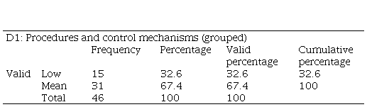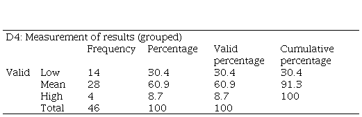 Table 6 shows that of the 46 officials interviewed, 54.3 % (25) have a low level, 37 % (17) have a mean level and 8.7 % (4) have a high level; in addition a percentage value of 100 % is observed, no missing data is presented.