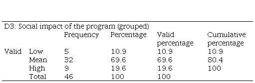 The social impact dimension of the program, for Guillen (2015) the impact of a social project or program is “the quantitative magnitude of the change in the problem of the target population as a result of the delivery of products (goods or services) to it” (p. 43). The indicators of this dimension were: effectiveness and scope; assessment and inspection tools, Vásquez (2011) indicated that “assessment and inspection are the primary tools for an adequate decentralization of the state, appropriately distributing public resources for the management of the various social programs” (p. 33); reduction of the poverty index, Vásquez (2011) stated that “the alleviation of poverty means temporarily solving a problem of unsatisfied basic need” (p. 105).