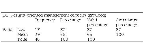 Table 9 shows that of the 46 officials interviewed, 47.8 % (22) have a low level, 43.5 % (20) have a mean level and 8.7 % (4) have a high level; in addition a percentage value of 100 % is observed, no missing data is presented.