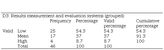 Finally, the dimension measurement of results. The indicators of this dimension are: reliable information systems (feedback) (Roberstshaw, Mecca, & Rerick, 1978); strategic evaluation, Van de Velde (2009) indicated that “really, within a new vision around the evaluative task, it is already widely recognized that evaluation as a functional technical capacity is a key component in the entire cycle of programs and projects” (p. 20).