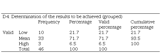 Table 7 shows that of the 46 officials interviewed, 21.7 % (10) have a low level, 71.7 % (33) have a mean level and 6.5 % (3) have a high level; in addition a percentage value of 100 % is observed, no missing data is presented.