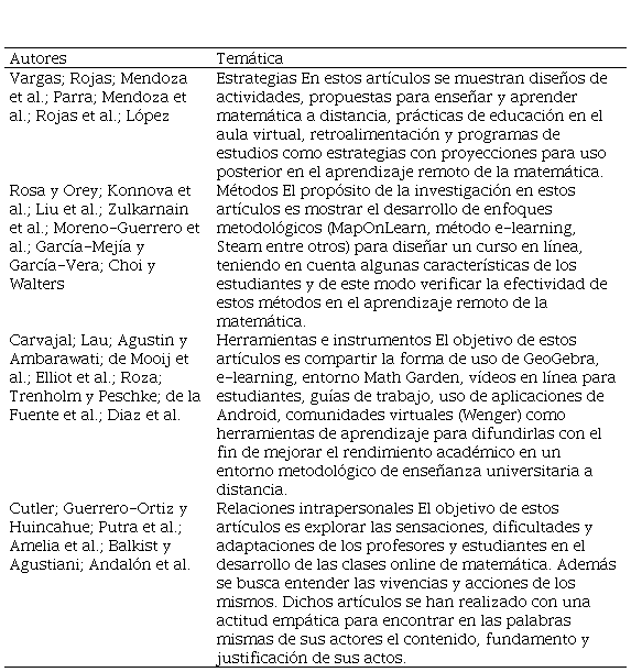 Las temáticas de producción de artículos de 2020 están relacionadas con el tiempo de pandemia. Sin embargo, sí existen estudios desarrollados antes de esta crisis sanitaria mundial (Rosa, & Orey, 2019; Mendoza et al., 2019; Agustin, & Ambarawati, 2019); y otros que muestran el interés por encontrar estrategias, métodos, herramientas e instrumentos para que el aprendizaje virtual de la matemática se desarrolle de manera óptima. Asimismo, Rojas (2020), Parra (2020), Rojas, Fernández y Llinares (2018), López (2020), proponen estrategias para ser aplicadas por otros docentes de matemática que enseñen en esta modalidad.