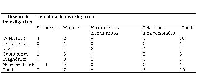 Se observa en la tabla 3 que el diseño de investigación más usado es el cualitativo con 16 artículos: 4 son de la temática de estrategias; 2 de métodos; 6 de herramientas e instrumentos y 4 de relaciones intrapersonales. Aquí están todas las temáticas encontradas, en donde se observa que los tipos de investigación menos aplicados son el documental y el diagnóstico y donde se encuentran un artículo de métodos y de herramientas e instrumentos y un artículo cuyo diseño de investigación es no especificado. El segundo diseño de investigación más utilizado es el cuantitativo, en donde figuran 6 artículos con tres temas: 1 de estrategias; 3 de métodos y 2 de relaciones intrapersonales.