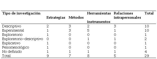 Los tipos de investigaciones más utilizados son el descriptivo y el experimental, cada uno de ellos con diez artículos en los que están todas las temáticas encontradas (cuatro de ellos con la temática de métodos). En los artículos de diseño están todas las temáticas encontradas; los tipos de investigación menos utilizados son el exploratorio, el explicativo y el fenomenológico, cada uno de ellos con un artículo en los que la temática de investigación es sobre las estrategias.