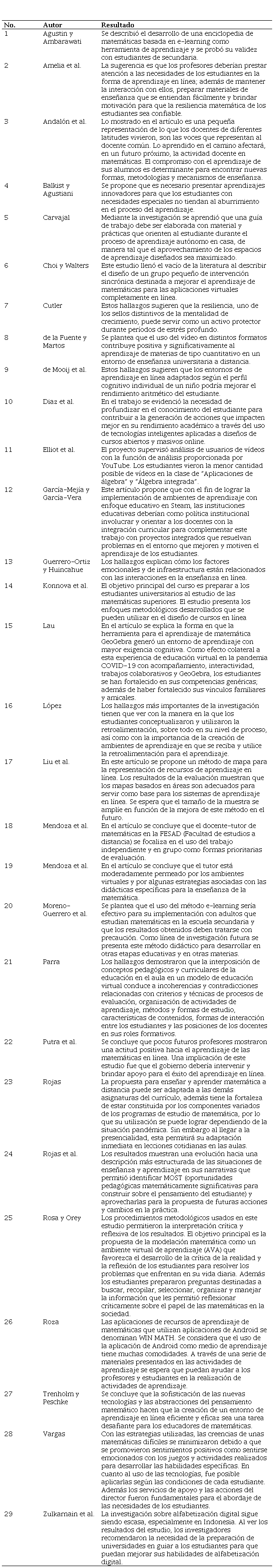 Por último, se puede observar la tabla 5 en la que se tiene el resultado obtenido en cada artículo de investigación sobre el aprendizaje remoto de la matemática según cada autor.