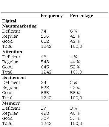 From the consumers' perception, the effectiveness of digital neuromarketing and its dimensions, was predominantly of good effectiveness (49 % in digital neuromarketing, 52 % in attention, 56 % in emotion, 57 % in memory), to a large extent this perception has been conditioned by the period of confinement.