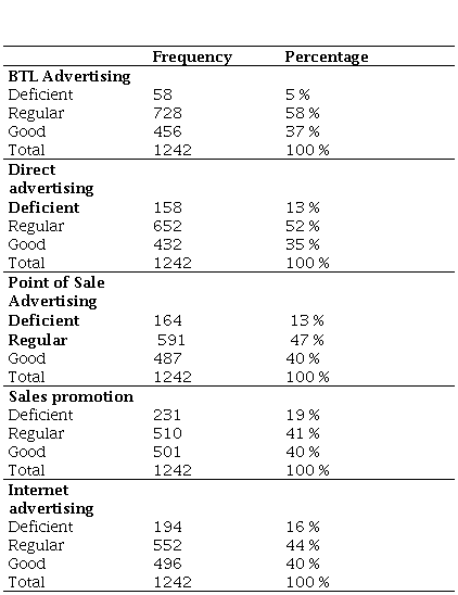 From the consumers' point of view, the effectiveness of BTL advertising and its dimensions, was predominantly regular (58 % in BTL advertising, 52 % in direct advertising, 47 % in point-of-sale advertising, 41 % in sales promotion and 44 % in internet advertising), consequently the effectiveness of BTL advertising, according to consumers, was lower than the effectiveness of digital neuromarketing.