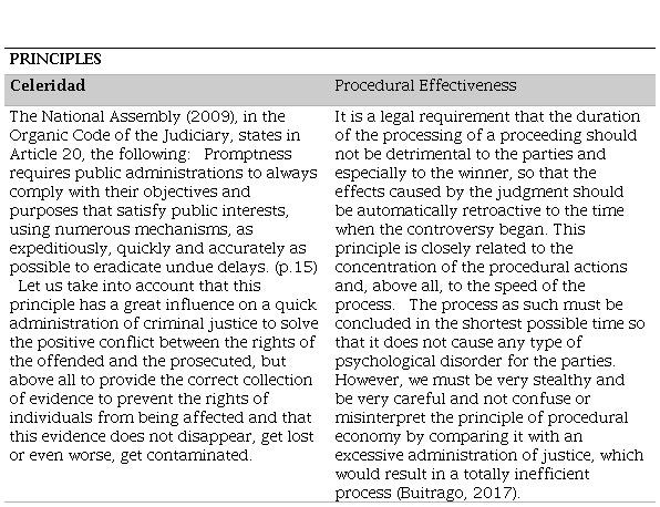 The following principles are enshrined in the Ecuadorian legal regulations within the Procedural System as established in the Constitution of the Republic of 2008, in its Article 169, which is in direct agreement with Article 18 of the Organic Code of the Judicial Function where it deals with the System - Means of Administration of Justice. Making it clear that the following principles and others are a fundamental part of the procedural system and especially in the application of alternative means of conflict resolution. (National Assembly, 2009)