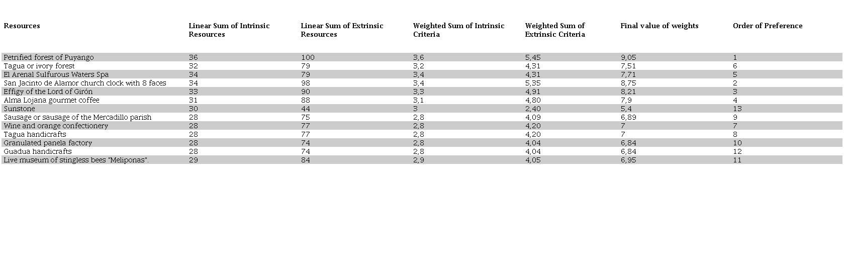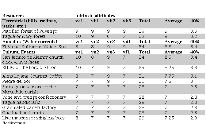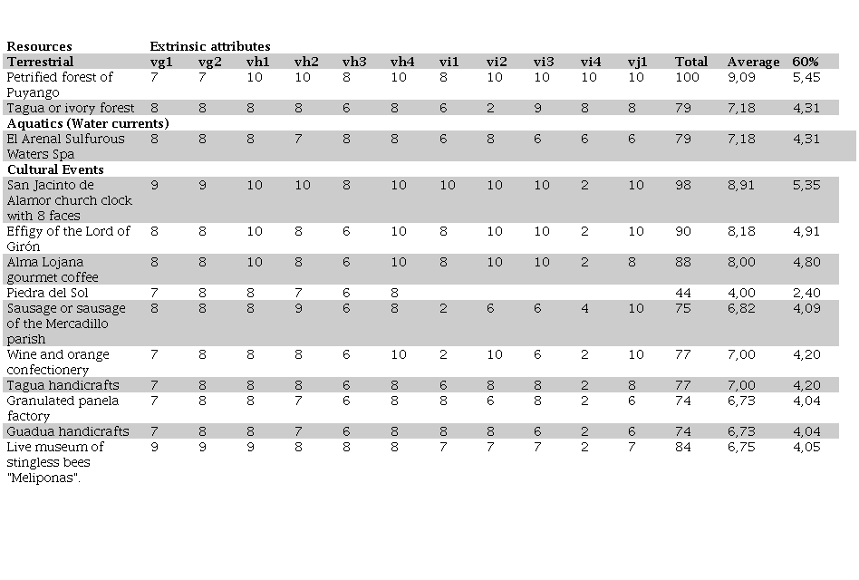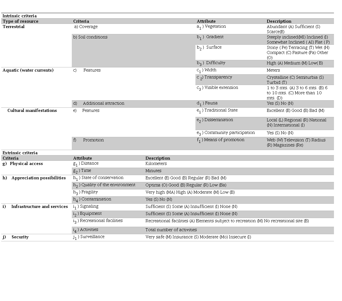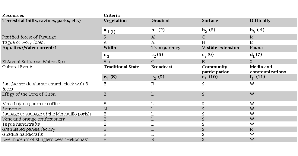 Once the field work has been carried out, the characterization matrix with a mixed approach is obtained. Table 2 below shows the characterization of the intrinsic criteria according to the type and name of the resources.