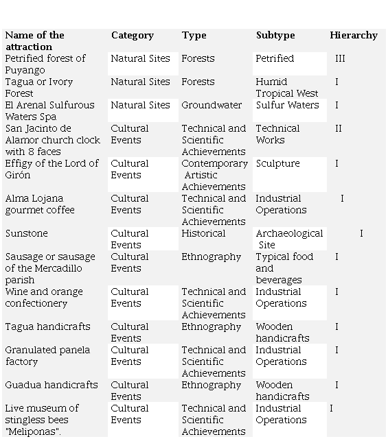 On the other hand, in the inventory of the tourist attractions of the Puyango canton, 13 attractions of tourist interest were inventoried.