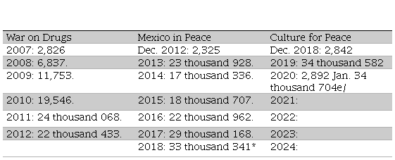 Comparing the figures, Peña Nieto's six-year term surpassed Calderón's by 60,304 homicides, since during the 2012-2018 period the figure reached 147,767 homicides compared to 87,463 during the 2006-2012 period. The figures for the first year and two months of the new government are not encouraging.