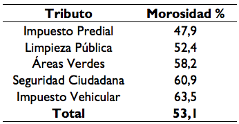 La morosidad total acumulada por deuda tributaria (Arbitrios de Limpieza Pública y Áreas Verdes e Impuestos Predial y Vehicular) del período 2013 representó el 53,1% sobre el total de contribuyentes. (Tabla 1)