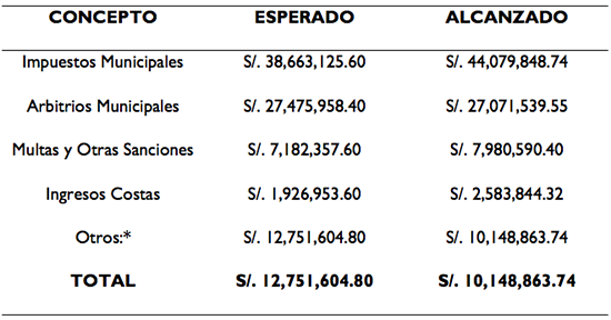 La composición promedio de la recaudación del 2013 (Figura 1) se dio de aproximadamente 53% de Impuestos Municipales, de 29% de Arbitrios Municipales, 14% en Multas y Otras Sanciones Tributarias y no Tributarias y 5% Otros operaciones o tasas, derechos.