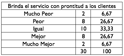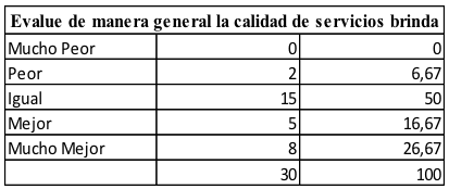 El 33% de la población encuestada opta por la opción igual, un 27% la opción mejor, el 27% de la población escogió la opción peor, el 7% toman la opción mucho mejor ya que dicen que el servicio el ligero, y un 6% mucho peor no les parece un servicio adecuado.