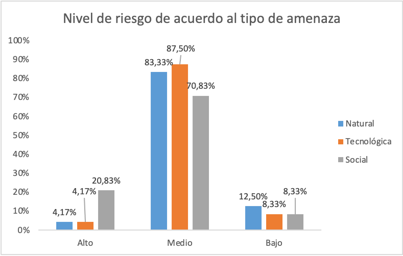 Continuando con los resultados y de acuerdo con el gráfico anterior, se puede indicar que las instituciones se encuentran en un nivel de riesgo medio, en donde se resalta las amenazas de tipo tecnológico asociado principalmente a la ocurrencia de incendios que puedan ser provocados por material sólido, como papel-plásticos, cartón, y papel archivo que se encuentran almacenadas o depositadas principalmente en áreas administrativas; otras de las amenazas de tipo tecnológico que se pueden originar en estos escenarios, son aquellos a los asociados con almacenamiento de materiales solidos o líquidos que pueden estar almacenados en los laboratorios de biología y química, que se utilizan en para el desarrollo de prácticas con los estudiantes , que al derramarse y entrar en contacto accidentalmente pueden generar reacción fisiológicas adversas, que pueda poner en riesgo la integridad físicas de las personas. Por último, con respecto a este tipo de amenazas identificadas, se pueden indicar que para que se materialice la ocurrencia de este tipo de eventos se puede deber a factores como desconocimiento sobre la deficiencia que pueda tener las sustancias y sus propiedades que al almacenarla cambien su composición.