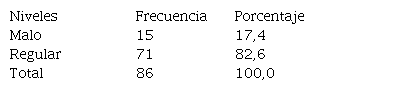 Resultados de la Tabla 2: Se puede observar que, para la variable capacitación según la encuesta, el nivel malo alcanzó un 17.4% y el nivel regular alcanzó el 82,6% en el departamento de enfermería del INSN, Lima, 2019.