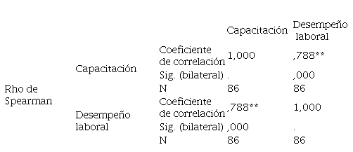 Abstract: The objective of this article is to make a correlation between training and job performance in the nursing department of the INSN. Initially, some antecedents related to job performance and training are raised; Subsequently, a conceptualization of training is carried out as a form of training in the institution, and finally, training is emphasized as the basis of the institution. It was concluded that there is evidence to affirm that Training is significantly related to job performance according to the contracted personnel of the nursing department surveyed, being that Spearman's Rho correlation coefficient of 0.788, in which there is a high correlation between the variables.