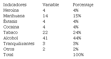 Las sustancias más consumidas en los adolescentes de este estudio son el alcohol con un 44%, el tabaco con un 24%, un 15% la marihuana, la heroína 4%, el éxtasis con 4%, así mismo la cocaína con un 4%, un 3% tranquilizantes y otro tipo de sustancias el 2%.