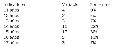 Según los resultados que dio la investigación se evidencia que el 38% de los estudiantes consumieron por primera vez algún tipo de sustancia a los 15 años, el 22% a los 14 años, el 11% a los 16 años, el 9% a los 11 años, un 14% a los 13 y 17 años y el 6% a los 12 años.