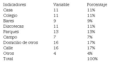 Los datos obtenidos muestran que el 34% de los estudiantes consumen drogas en el domicilio de otros y en la calle, el 13% en parques, un 33% en su casa, colegio y discotecas, el 9% en bares, el 7% en el campo y el 4% en algún otro lugar.