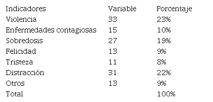 Según los datos obtenidos el 23% de los estudiantes consideran que las sustancias producen violencia, el 22% distracción, el 19% sobredosis, el 10% enfermedades contagiosas, el 9 % felicidad, el 8% tristeza y otro 9% indicaron algún otro efecto que producen las sustancias.