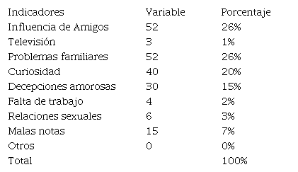 Según las encuestas aplicadas el 26% de los estudiantes mencionan que lo que conlleva a una persona a consumir drogas es la influencia de amigos, otro 26% indican que es por problemas familiares, un 20% por curiosidad, un 15% por decepciones amorosas, el 7% por malas notas, el 3% por relaciones sexuales, y el 1% por televisión.