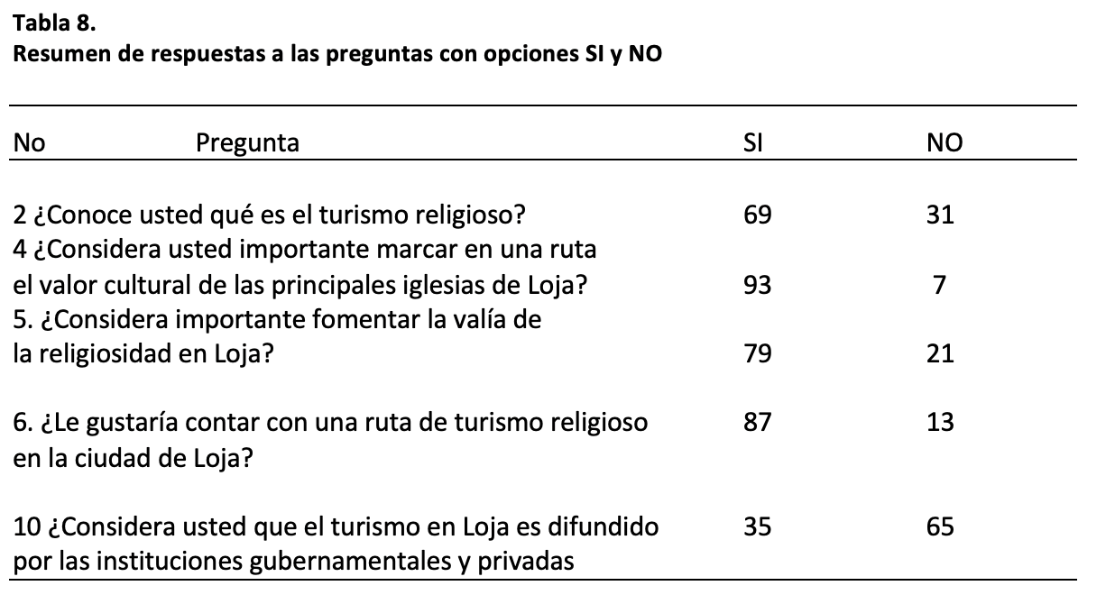Mediante el diagnóstico del sistema turístico de la ciudad de Loja, se conoce que los factores que motivan el turismo religioso están ligados a sus raíces religiosas y al valor cultural que cada uno de los atractivos de índole cultural- religiosa posee. Sin embargo, la investigación de mercado se determina las expectativas del público objetivo (ciudadanos de Loja) para el diseño de una Ruta de Turismo Religioso en rescate al valor del patrimonio cultural de la ciudad de Loja y de los principales atractivos que posee. Como resultado, el diseño de la ruta de turismo religioso proyecta un acercamiento físico insitu que permite disfrutar de la riqueza arquitectónica, pictórica, artística de cada atractivo y principalmente, convivir con el sentir religioso de una ciudad eminentemente católica.