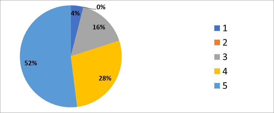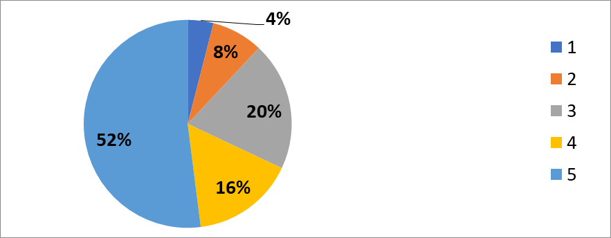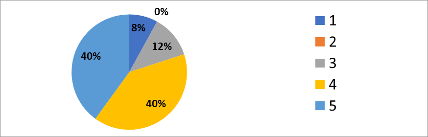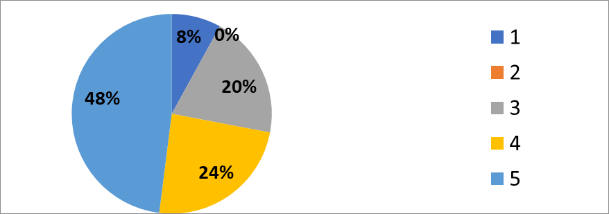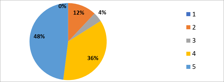 La presentación secuenciada y adaptada de la información correspondiente a la planificación de la clase, permite que, el estudiante pueda adquirir el conocimiento adecuado de la temática correspondiente. Como se puede observar en la Tabla 2, de 25 estudiantes encuestados, 9 se identificaron como muy satisfechos (36%) con esta competencia de Comunicación. Para un 32 % de los encuestados (8), su grado de satisfacción fue puntuado en 4 sobre 5; algo similar fue la respuesta de 7 estudiantes (28 %) quienes evaluaron esta competencia con 3 sobre 5. Solo un 4% (un estudiante) de los encuestados manifestó no estar de acuerdo con la manera de presentar esta competencia por parte del docente. Ver Gráfico 2.