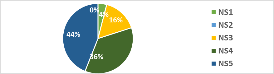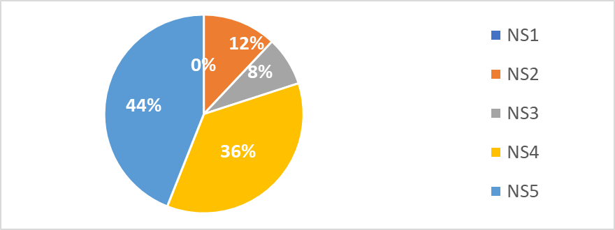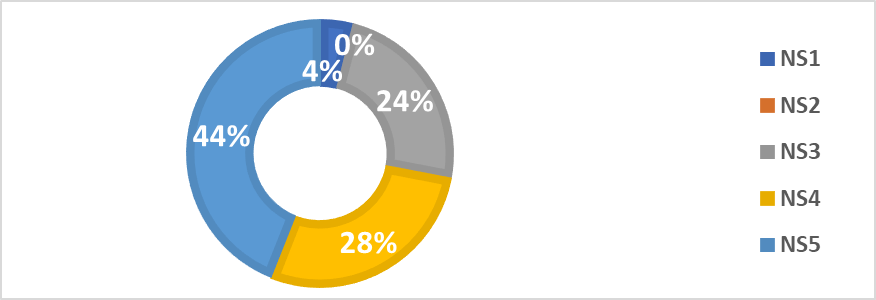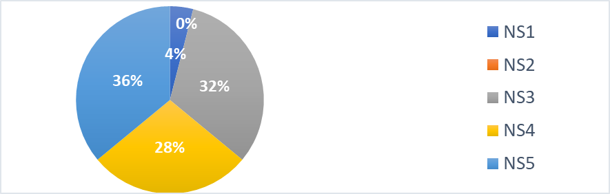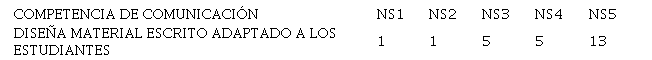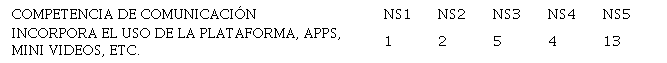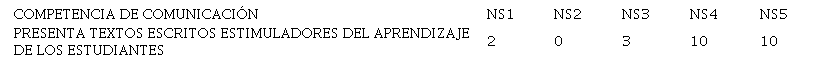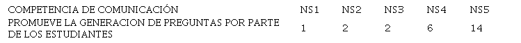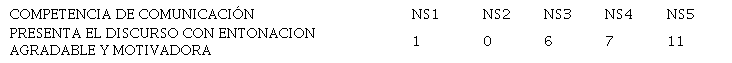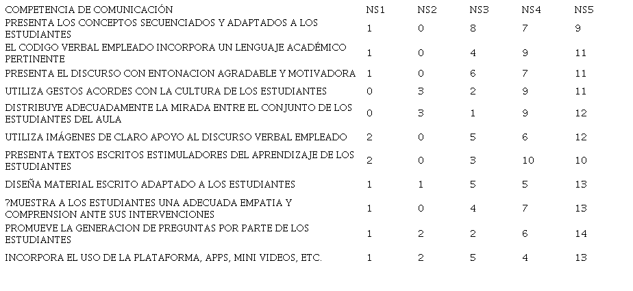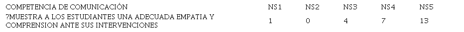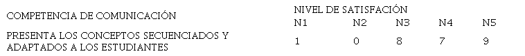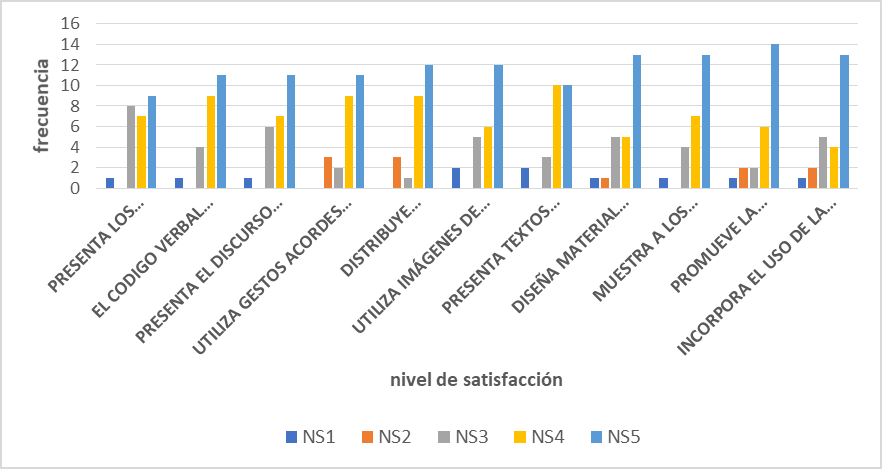 En la Tabla 1 y Gráfico 1, podemos observar la evaluación realizada por los estudiantes a la metodología empleada por el docente como Competencia de Comunicación, en base a preguntas que fueron calificadas con una escala del 1 al 5 el nivel de satisfacción (NS), donde 1 indica nada satisfactorio, hasta llegar al 5 que indica muy satisfactorio.