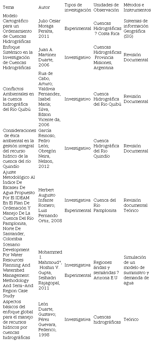 La investigación se basa en una revisión documental y bibliográfica de la literatura publicada en el país y en otros países, relacionada con la planificación y manejo de los recursos naturales e hídricos en las cuencas hidrográficas, con el fin de reconoces e identificar las alternativas actualmente implementadas para la conservación, mejoramiento y aprovechamiento del recurso hídrico en las cuencas hidrográficas, y posteriormente, implementarlas en el diseño de estrategias que se puedan aplicar para la planificación y manejo de la cuenca de Rio Seco.
